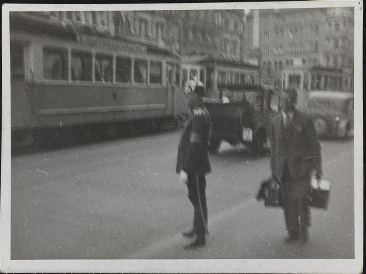 [Horse-drawn carriage on city street.]