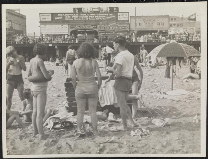 [People relaxing on Coney Island beach.]