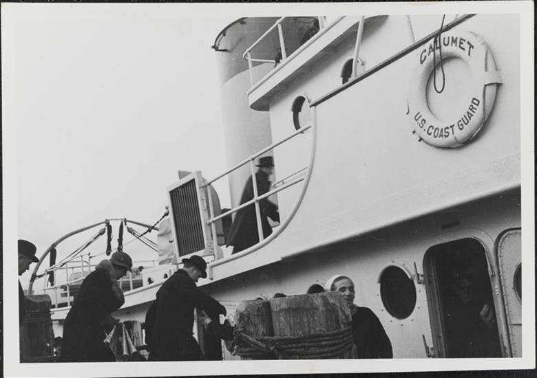 [People boarding the U.S. Coast Guard tug Calumet.]