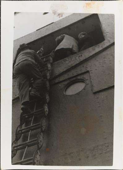 [Crew member climbing down ladder from ship.]