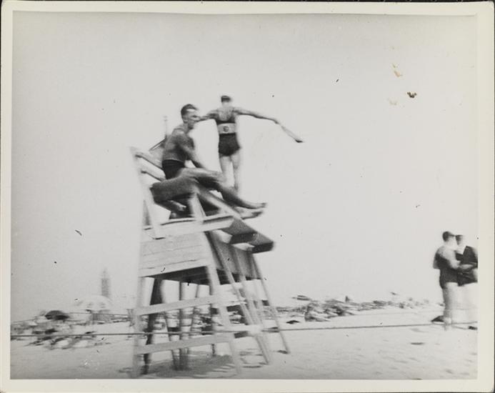 [Crowd gathered around lifeguard stand on Coney Island beach.]