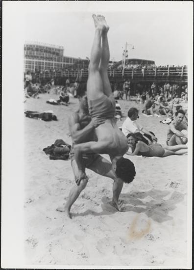 [Group of teenage boys performing stunt on Coney Island beach.]