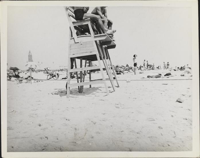 [Crowd gathered around lifeguard stand on Coney Island beach.]
