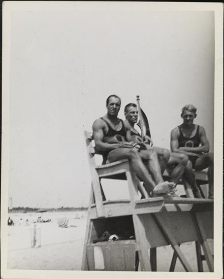 [Crowd gathered around lifeguard stand on Coney Island beach.]
