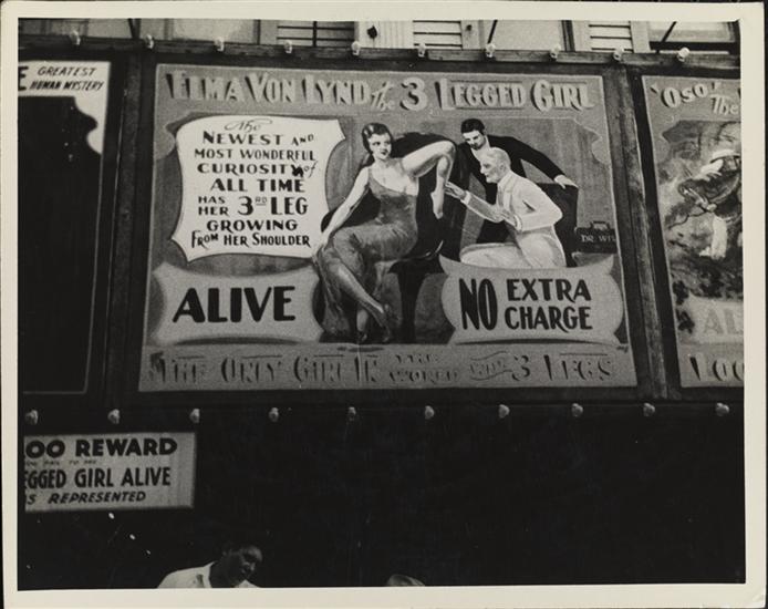 [Sideshow talker pointing to sign advertising Elma Von Lynd, the 3 Legged Girl.]