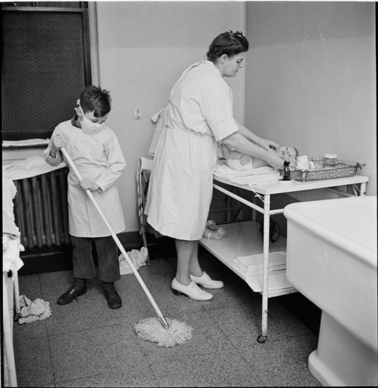 Orphanage [Nurse changing a diaper while a boy sweeps.]
