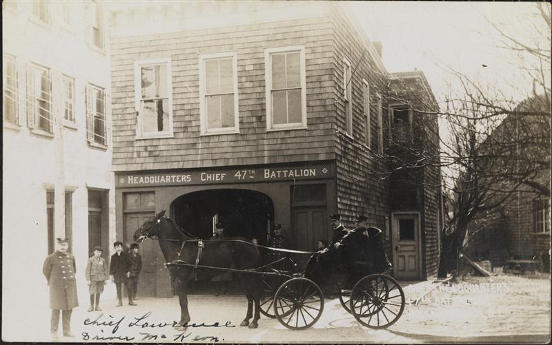 [Horse-drawn fire engine outside the Central Fire Station.]