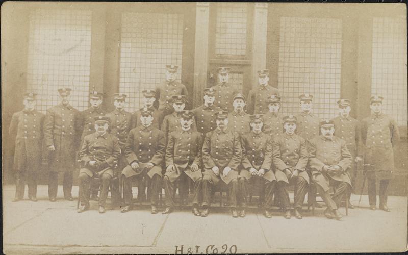[Group portrait of firemen, including Ed Worth, Chief of 3rd Battalion.]