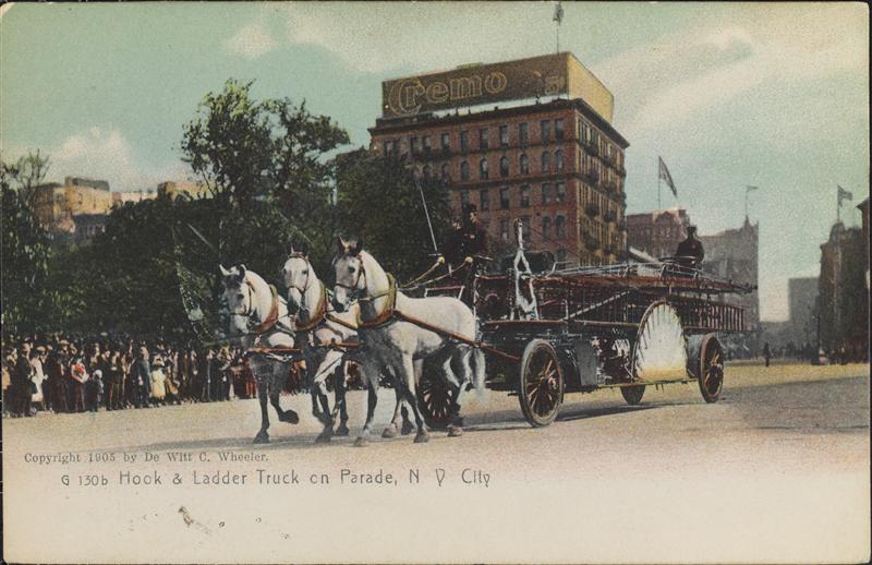 [A. Horse-drawn fire equipment in a parade ; B. Horse-drawn fire equipment in a parade.]