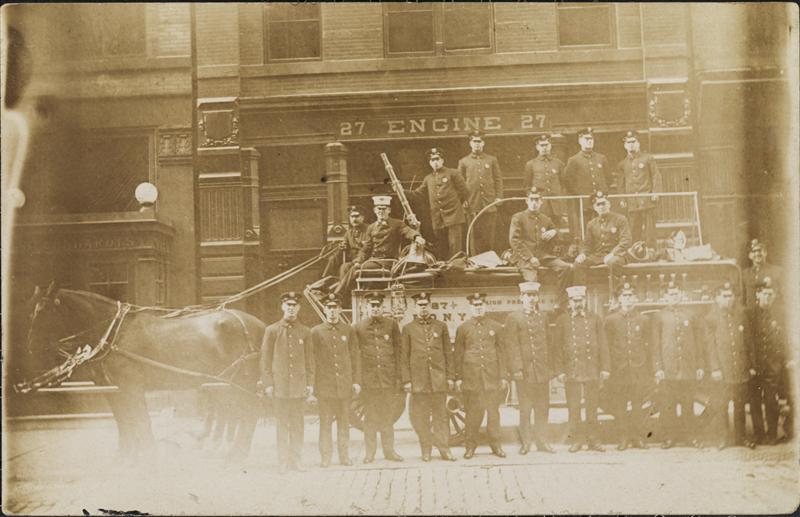 [Horse-drawn fire engine outside the Central Fire Station.]