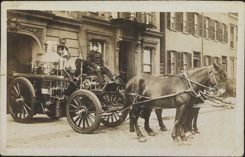 [Horse-drawn fire engine outside the Central Fire Station.]