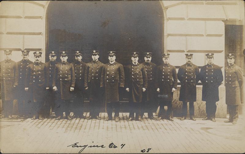[Group portrait of firemen outside the station for Engine 7.]