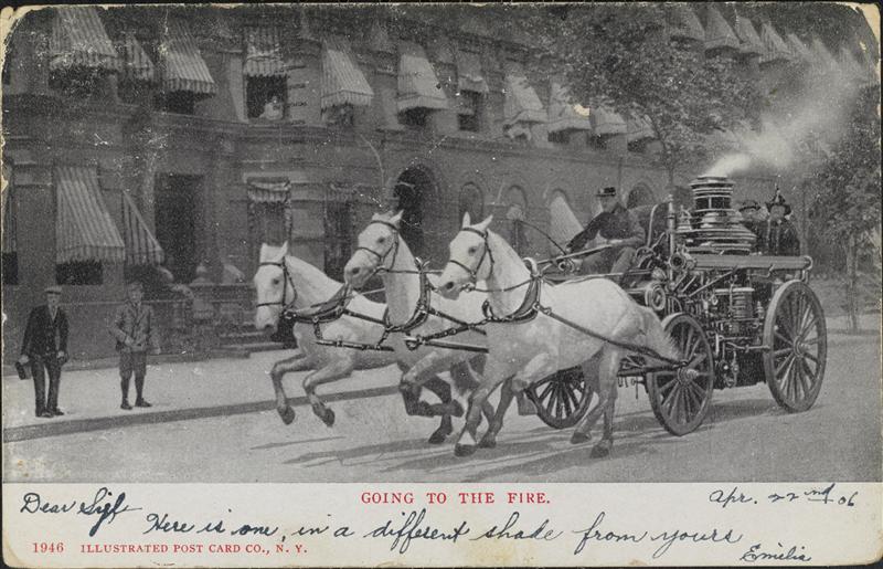 [Horse-drawn fire engine outside the Central Fire Station.]