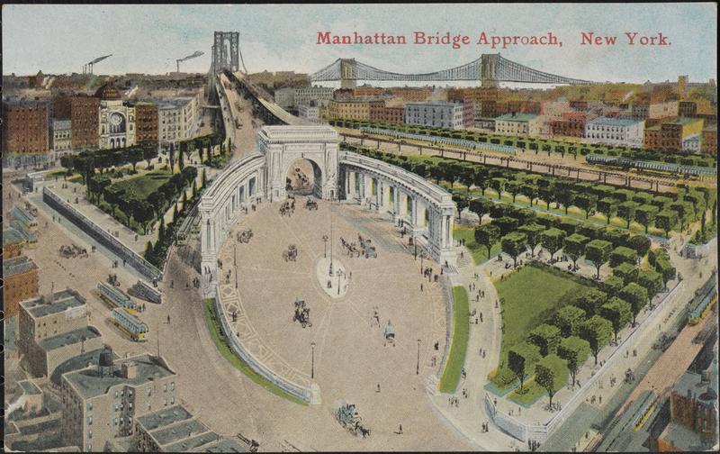 Woolworth and Municipal Buildings, from Brooklyn Bridge, New York.