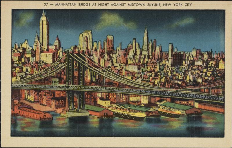 Skyline of Lower Manhattan at Night from Under Brooklyn Bridge, New York City