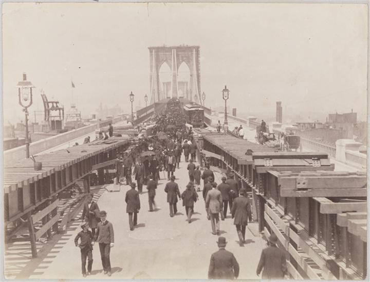 [A. Pedestrians on Brooklyn Bridge ; B. Brooklyn Bridge.]