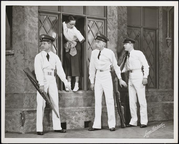 [José Ferrer as Dan Crawford, Frank Albertson as Billy Randolph, and Eddie Albert as Bing Edwards in "Brother Rat".]