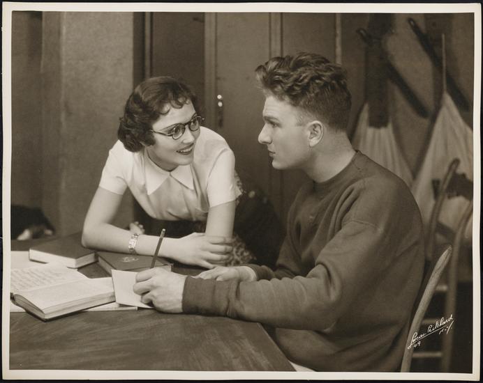 [Mary Mason as Claire Ramm and Wyn Cahoon as Joyce Winfree in "Brother Rat".]