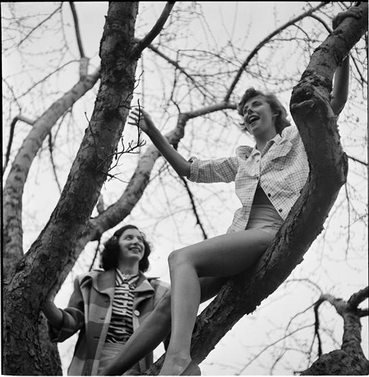 Betsy Von Furstenberg [Swinging from a tree branch.]