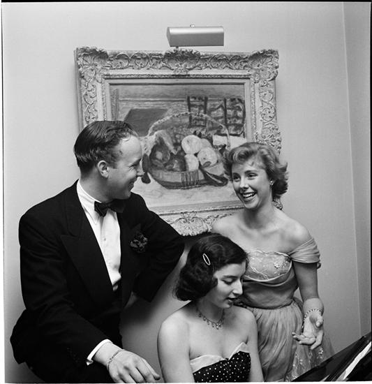 Betsy Von Furstenberg [Sitting on a banister, with friends.]