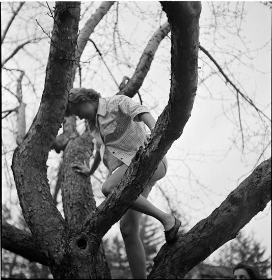 Betsy Von Furstenberg [Swinging from a tree branch.]