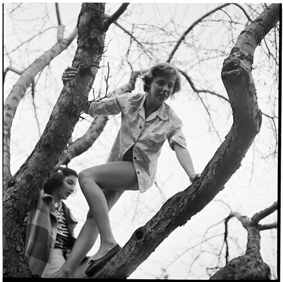 Betsy Von Furstenberg [Swinging from a tree branch.]