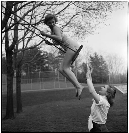 Betsy Von Furstenberg [Swinging from a tree branch.]