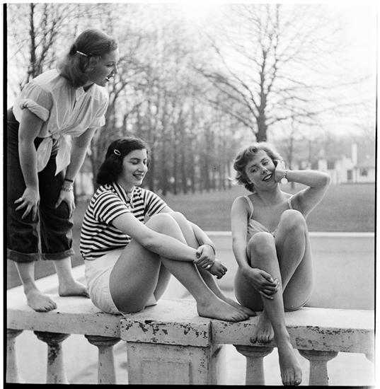 Betsy Von Furstenberg [Sitting on a banister, with friends.]