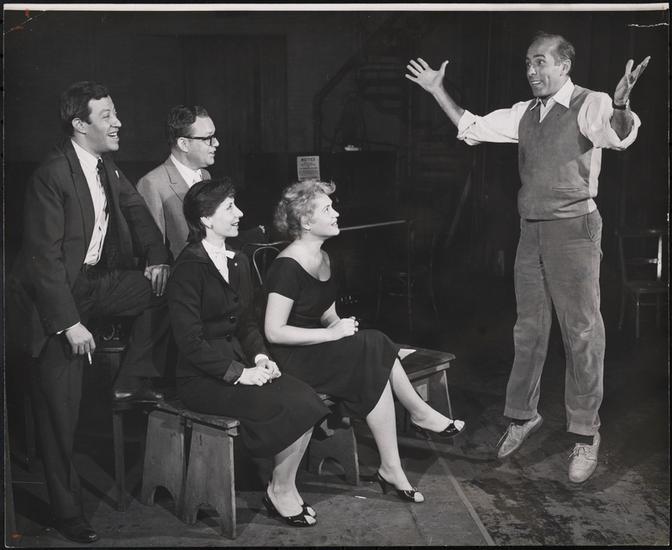 [Judy Holliday, Sydney Chaplin and Jerome Robbins during a rehearsal for "Bells Are Ringing".]