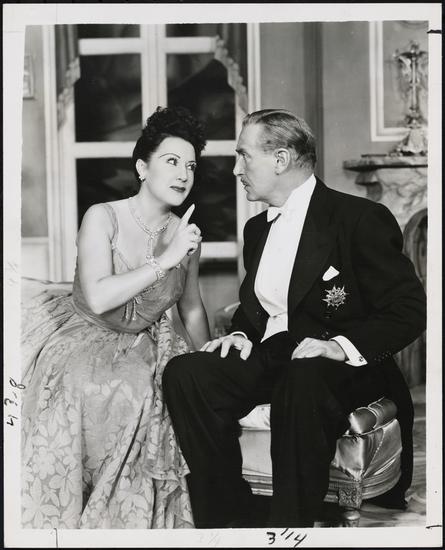 [Ethel Merman as Mrs. Sally Adams and Paul Lukas as Cosmo Constantine in "Call Me Madam".]