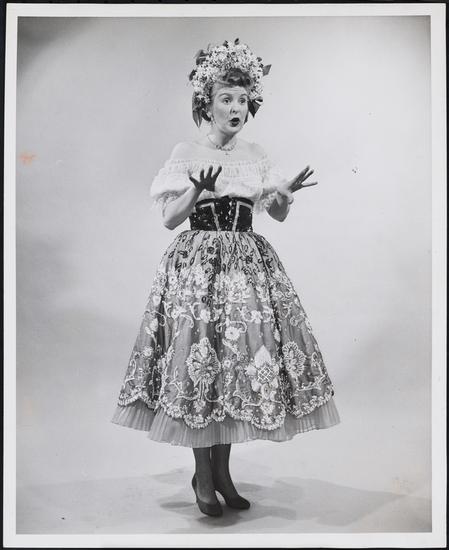 [Ethel Merman as Mrs. Sally Adams in "Call Me Madam".]