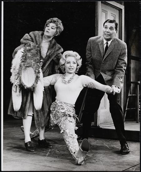 [Kay Medford as Mae Peterson, Norma Richardson as Gloria Rasputin, and Dick Van Dyke as Albert Peterson in "Bye Bye Birdie".]