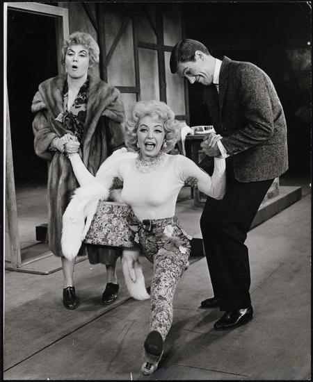 [Chita Rivera as Rose Grant, Kay Medford as Mae Peterson, and Dick Van Dyke as Albert Peterson in "Bye Bye Birdie".]