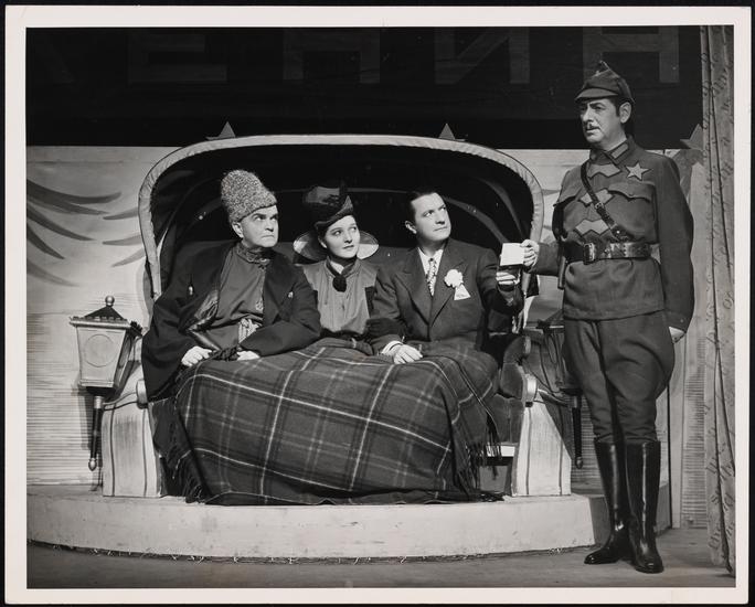 William Gaxton as Buckley Joyce Thomas, Victor Moore as Alonzo P. Goodhue and Sophie Tucker as Mrs. Goodhue on tour for "Leave It to Me!".]
