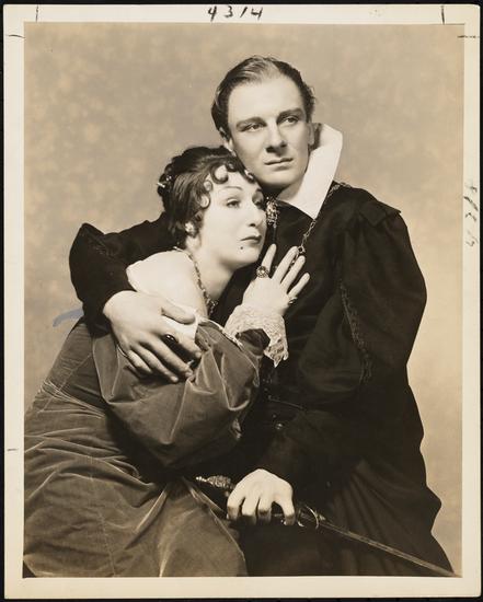 [Lillian Gish as Ophelia and John Gielgud in the title role of "Hamlet".]