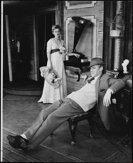 [Possibly Ronald Radd as Alfred P. Doolittle and Pamela Charles as Eliza Doolittle in "My Fair Lady".]
