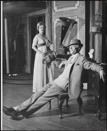 [Possibly Ronald Radd as Alfred P. Doolittle and Pamela Charles as Eliza Doolittle in "My Fair Lady".]