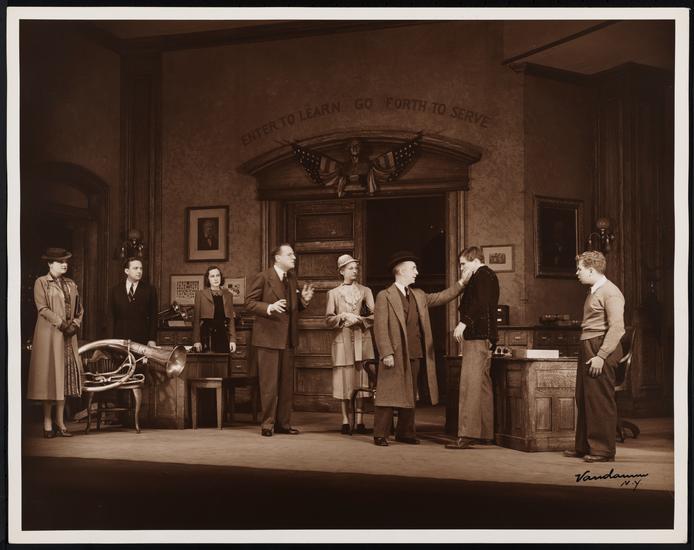 [Ezra Stone as Henry Aldrich, Vaughan Glaser as Mr. Bradley and James Corner as George Bigelow in "What a Life".]