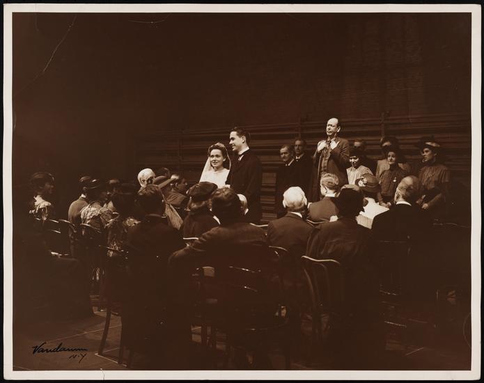 [Martha Scott as Emily Webb, Frank Craven as the Stage Manager and John Craven as George Gibbs in the wedding scene of "Our Town".]