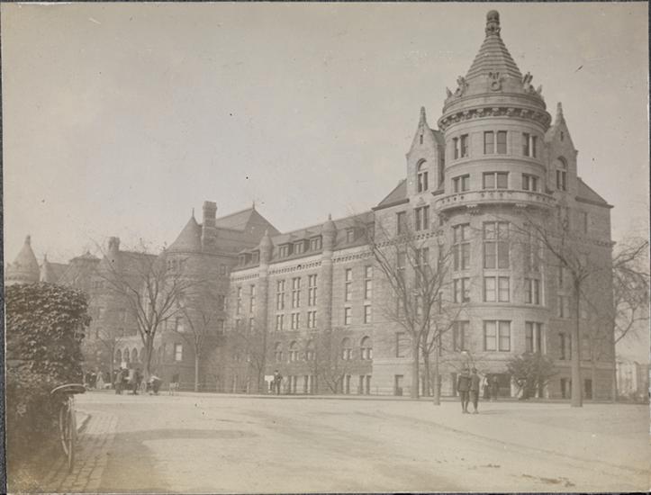 [200 Central Park West. American Museum of Natural History. Exterior, night view.]