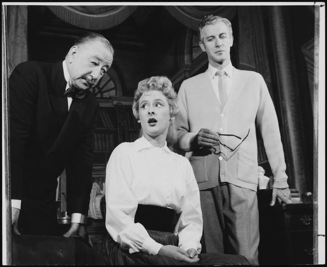 [Melville Cooper as Colonel Pickering, Pamela Charles as Eliza Doolittle and Edward Mulhare as Henry Higgins in "My Fair Lady".]