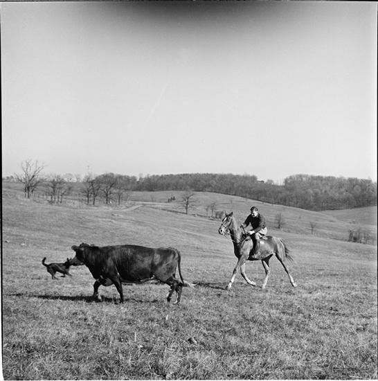Arthur Godfrey [Godfrey on a farm, with a cow.]