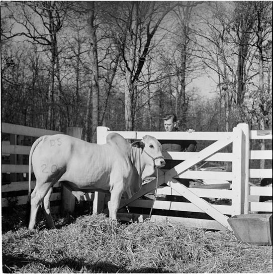 Arthur Godfrey [Godfrey on a farm, with a cow.]