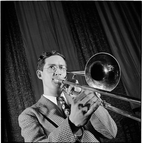 Swing Band Contest Sponsored by LOOK [Man playing the trombone.]