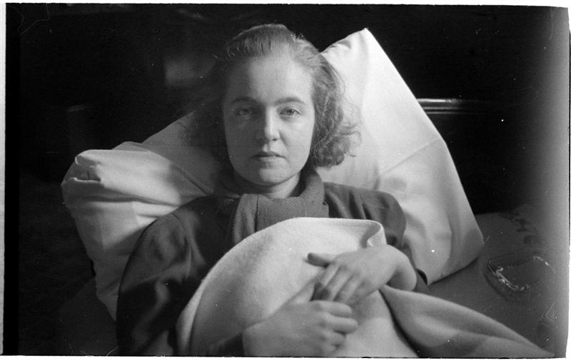 [Felicia Marsh with breakfast tray in bed.]