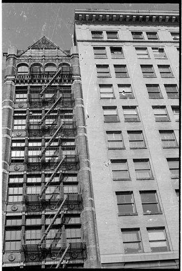 [Man leaning outside of window, with watercolor of Bowery scene to his right.]