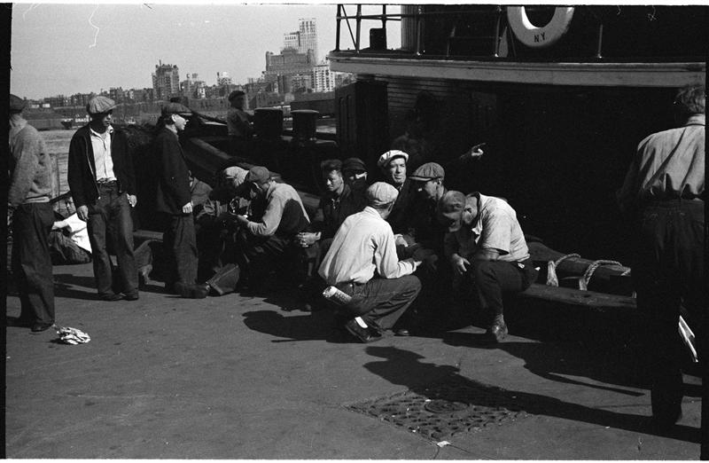 [Destitute men on East River pier with Brooklyn skyline visible.]