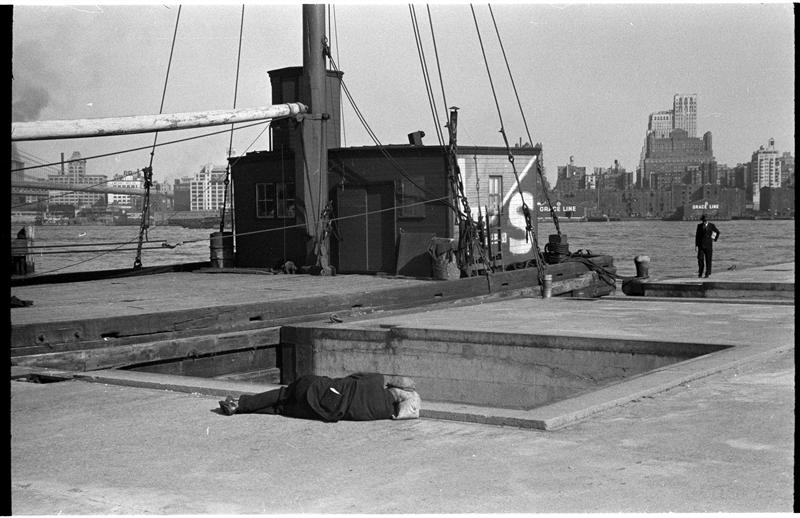[Destitute men sleeping on East River pier with Brooklyn skyline visible.]