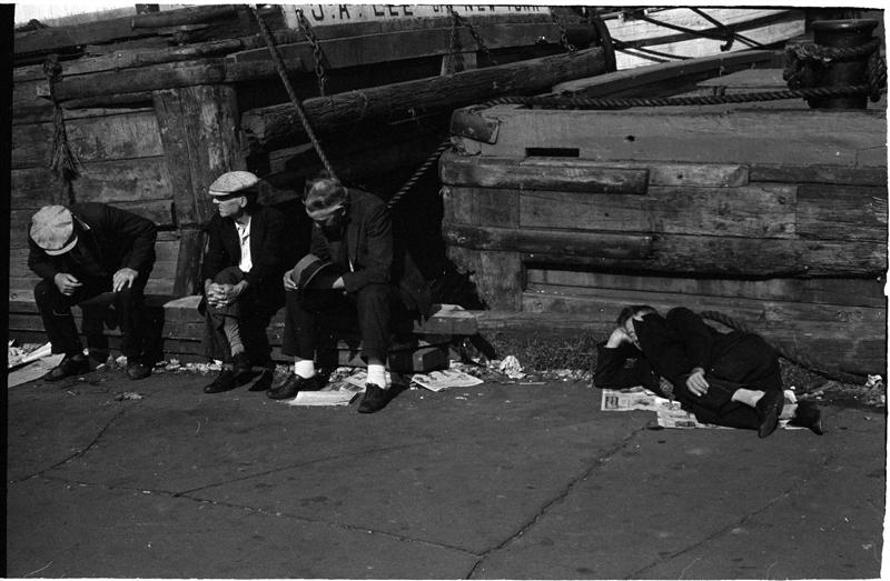 [Destitute men on East River pier with Brooklyn skyline visible.]