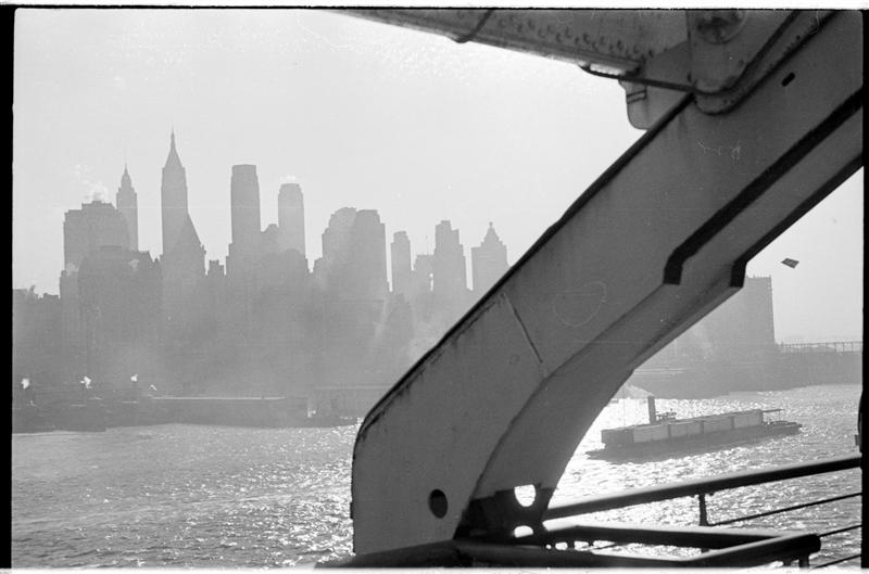 [Men hanging out on deck of ship with view of Manhattan skyline.]